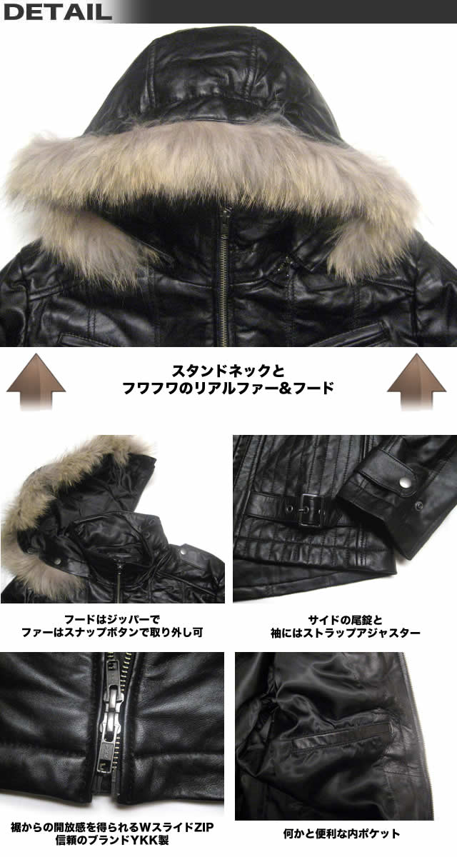 Ville D'Espoir 14803/本革ラムレザー/ファーフードジャケット 【Ville D'Espoir】 品番 :VDM-14803 カラー:ブラック ■柔らかくしなやかな上質なラムレザー(本革)を縦に裁断し Wステッチで強度を上げたシャープな印象のライダーススタイルファーフードジャケットです。