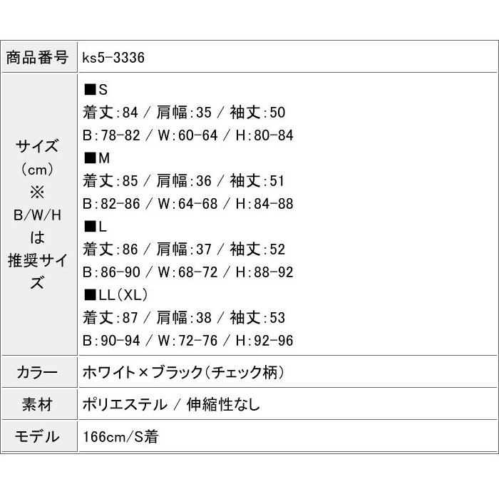 商品番号 ks5-3336 サイズ(cm)※B/W/Hは推奨サイズ ■S着丈:84 / 肩幅:35 / 袖丈:50 / B:78-82 / W:60-64 / H:80-84■M着丈:85 / 肩幅:36 / 袖丈:51 / B:82-86 / W:64-68 / H:84-88■L着丈:86 / 肩幅:37 / 袖丈:52 / B:86-90 / W:68-72 / H:88-92■LL(XL)着丈:87 / 肩幅:38 / 袖丈:53 / B:90-94 / W:72-76 / H:92-96 カラー ホワイト×ブラック(チェック柄) 素材 ポリエステル / 伸縮性なし モデル 166cm/S着 詳細 エレガントに上品に着こなせるオーラを漂わせ、少し大きめに開いた胸元がセクシーな印象の、ショート丈の7分袖ミニワンピースです。